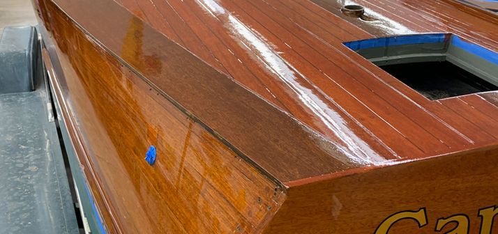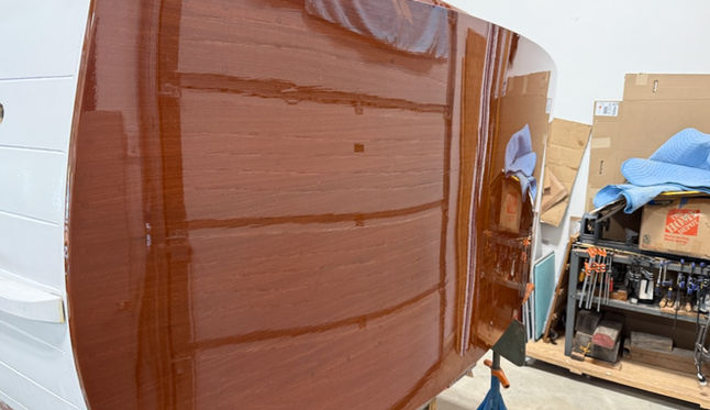 Daryl had just finished applying the twelfth coat of varnish when a burst of dust swept into the shop, marring the final finish. He’s planning to sand it down and recoat once the space is fully cleaned — a frustrating moment, but one many boat restorers can relate to.