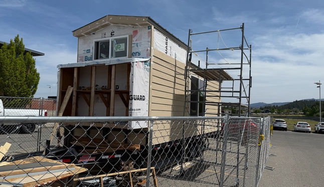 Outside in the parking lot, students were hard at work on a tiny house project led by Spokane Home Builders LLC. Siding was going up during our visit, with plans to complete the home before the school year wraps up.