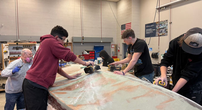 This isn’t a student project from start to finish, so the first big task was flipping the boat, which we estimated to weigh around 1,100 pounds. With enough hands on deck, flipping a 17-foot boat really isn’t a big deal. Under the watchful eye of Central Valley High Schools teacher Ron Beard, the students slid a few 2x6s under the trailer and rolled the boat right over onto it. Job #1—done.